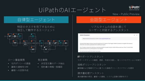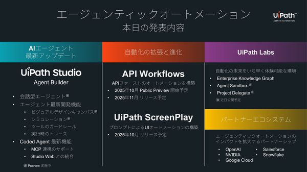 UiPathは2025年10月16日、ワークフロー自動化製品群「UiPath Platform for Agentic Automation」に直近で追加する機能群を説明した。AIエージェントをビジュアル開発する機能、エージェントとの対話を介してエージェントを開発する機能、画面操作を自然言語で指定して自動実行させる機能など、各種機能を追加する。