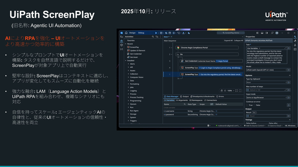 2025年10月には、画面操作を自然言語で指示して自動実行させることが可能なツール「UiPath ScreenPlay」(旧称は「Agentic UI Automation」)をリリースする(図4)。例えば、「コンプライアンスポータルにログインし、最新のがん治験申請を見つけ、有害事象の件数が最も多いものについて主任研究者に連絡するメッセージを作成する」といった指示を指定するだけで、繰り返して実行する処理を定義できる。