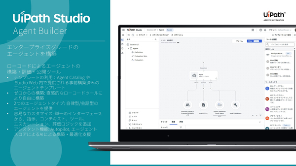 UiPathの「UiPath Platform for Agentic Automation」は、AIエージェントを自動化ワークフローに組み込むための製品群である。ワークフロー基盤ソフトウェア「UiPath Maestro」やAIエージェント開発ツール「Agent Builder」など複数の機能で構成する(関連記事:UiPath、AIエージェントをワークフローに組み込む製品群を「UiPath Platform for Agentic Automation」として体系化)。