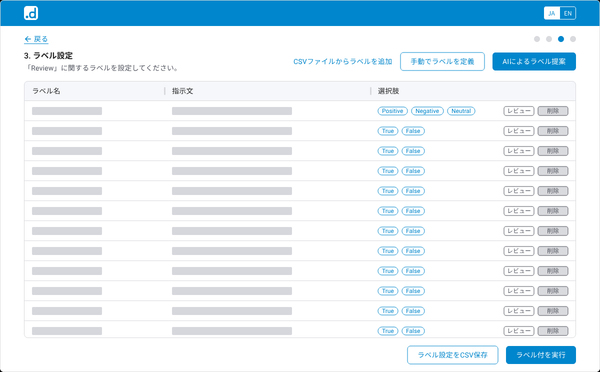 データを加工する際に使う生成AIへの指示文(プロンプト)は、加工結果に対してOK/NGのフィードバックを与えるだけでチューニングが可能という。否定表現や言い換え、業界特有の記述にも順応し、また、繰り返して使うことでラベル抽出の精度が向上するとしている。