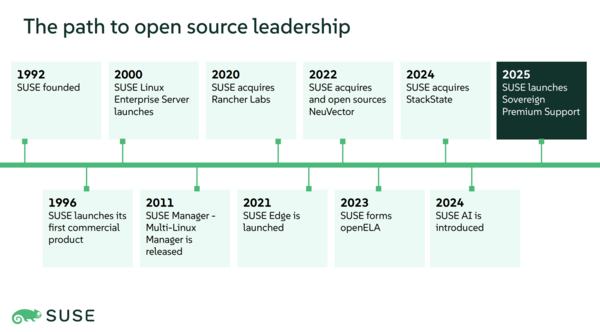SUSEは長年、看板製品のLinuxディストリビューション「SUSE Enterprise Linux」をはじめとする各種のオープンソースソフトウェア(OSS)の商用提供を行っているほか、同じドイツのソフトウェアベンダーであるSAPとも密接な協力関係を築いている。また、米IBMのメインフレームがLinuxをサポートする際にSUSE Linuxが選ばれるなど、OSSベンダーの中ではかなりユニークな道のりを歩んできた企業でもある(図1)。こうした経緯からも、SUSEは、適切な選択肢を市場に安定的に供給し続けることの価値について、説得力を持って語れる立場にある企業だと言えるだろう。