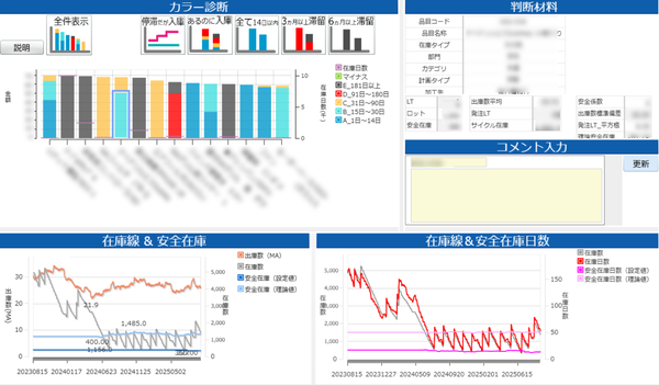 これらの課題を解決するため、ウイングアーク1stのBIダッシュボード「MotionBoard」の「在庫適正化テンプレート」(画面1)を導入した。製品・部品在庫の状況を分析・可視化するダッシュボードを6カ月間で構築し、2024年10月に稼働開始した。