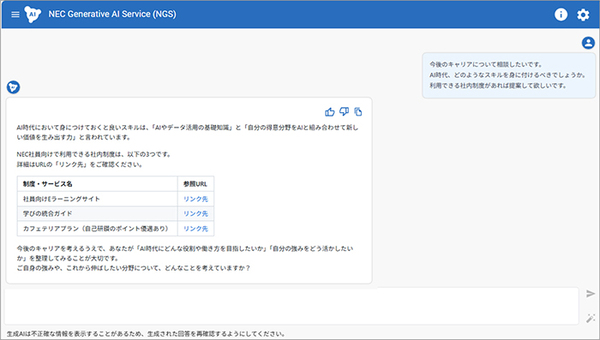 NEC社内で先行的に利用しているツールで、キャリアに関する悩みや相談事を入力すると、助言やスキルアップに向けた研修コースの提案が返ってくる。生成AIの回答の元になるナレッジとして、キャリアやカウンセリングに関する代表的な理論に加え、社員とキャリアアドバイザーによる過去5年分の相談傾向を学習している。