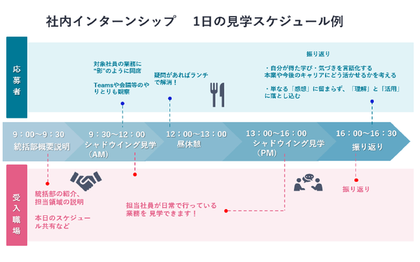別の取り組みとして、他部署の業務を1日または半日体験できる社内インターンシッププログラム「NEC ジョブシャドウイング」を構築してNEC社内で開始した。従業員は、他の部署のジョブを知ってキャリアを考える機会を得られる。このプログラムを利用する社員の所属部署にとっては、他部署との関係構築や連携強化、体験した社員による新たな知見の還元が期待できるとしている(図2)。