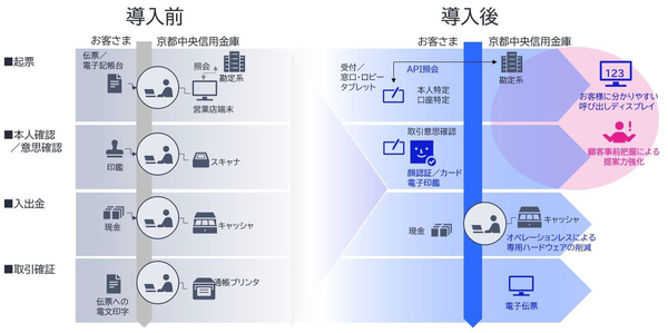 京都中央信用金庫(本店:京都市下京区)は2025年10月21日、新営業店システムを導入し、店頭ロビーと窓口に来店客向けのタブレット端末を設置した。これまで来店客は手続きにあたって複数の伝票や申込書類に記入・捺印する必要があったが、これをタブレット端末への入力操作で完結するようにした。合わせて、来店客の認証手段として顔認証を導入している。NECがシステムを提供・構築した。