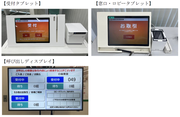 約70店舗で、従来のEQシステム(番号カードを発券する窓口受付システム)に代わる「受付タブレット」と「呼び出しディスプレイ」を設置する。来店時に要件を把握することで、スムーズに案内できるようになる(写真1)。