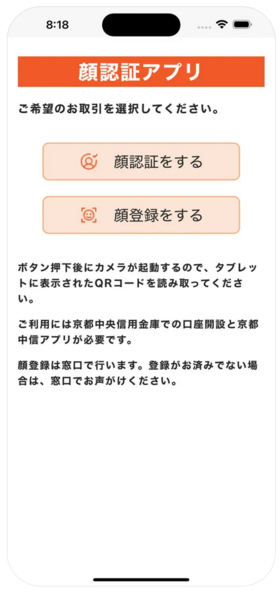 合わせて、3種類の本人認証手段(顔認証、キャッシュカード認証、電子印鑑認証)を導入し、ユーザー認証には通帳の持参や伝票への押印を不要にしている。iOS/Androidアプリの「京都中信顔認証アプリ」(画面1)に顔情報を登録しておくことで、顔認証と暗証番号で取引できる。電子印鑑認証は、印鑑パッドへの押印操作により、朱肉を付けていない印鑑をスキャンして認証する仕組みである。