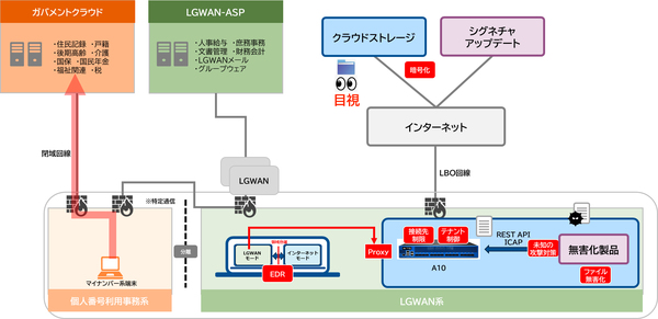 図1は、検証環境のシステム構成である。エンドユーザーは、LGWAN接続系端末からプロキシサーバー「A10 Thunder」を介してWebブラウザでクラウドストレージにアクセスする。プロキシサーバーはファイル無害化製品とICAP連携する。マルウェア対策として、(Content Disarm and Reconstruction:コンテンツ無害化・再構築)とサンドボックスによる動的なふるまい検知を組み合わせた。