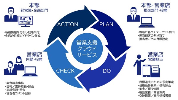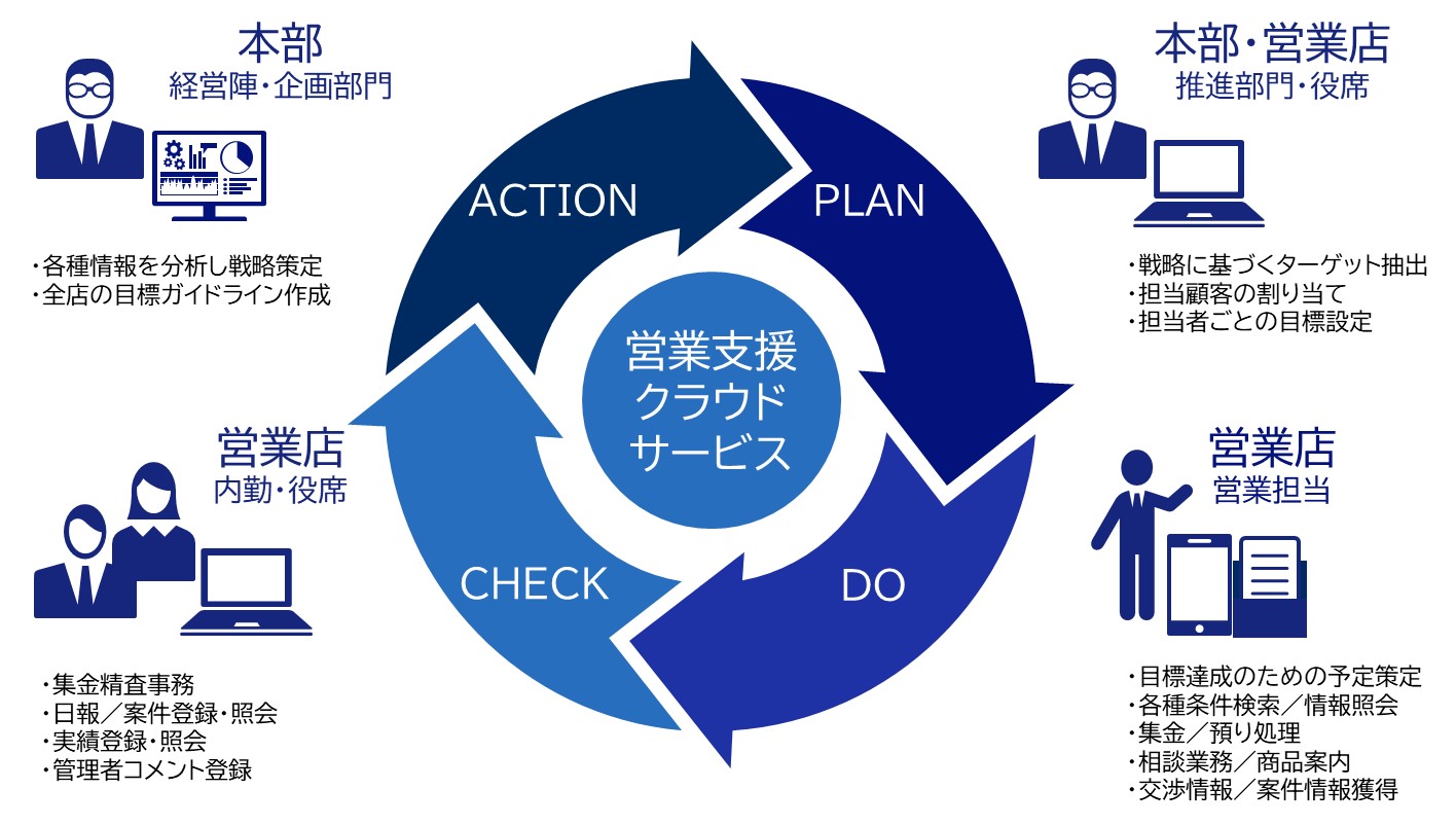NECの「営業支援クラウドサービス」は、全国55の信用金庫が採用するパッケージソフトウェア「信用金庫向け営業支援システム」のSaaS版である。地域金融機関の渉外・営業活動サイクルに基づき、営業計画の立案から実行、管理、分析までを支援する(図1)。