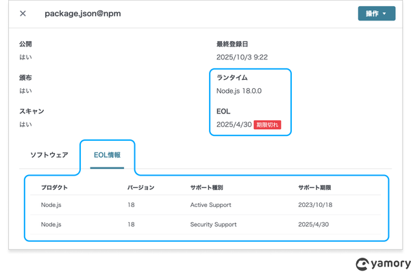 仕組みとして、スキャン対象ソフトウェアのマニフェストファイル(Node.jsならpackage.json、JARならMANIFEST.MF)からランタイムのバージョン情報を取得する。その情報をyamoryの脆弱性データベースと照合し、ランタイムのEOLを自動で検出する。