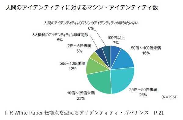 日本においても、アイ・ティ・アール(ITR)が国内企業を対象に行った「アイデンティティに対する企業の取り組み状況調査2024」によると、72%の企業が人間のアイデンティティと比べて10倍以上のマシンアイデンティティを保有しており、そのうち7%は人間のアイデンティティの100倍以上のマシンアイデンティティ数に達しています(図2)。