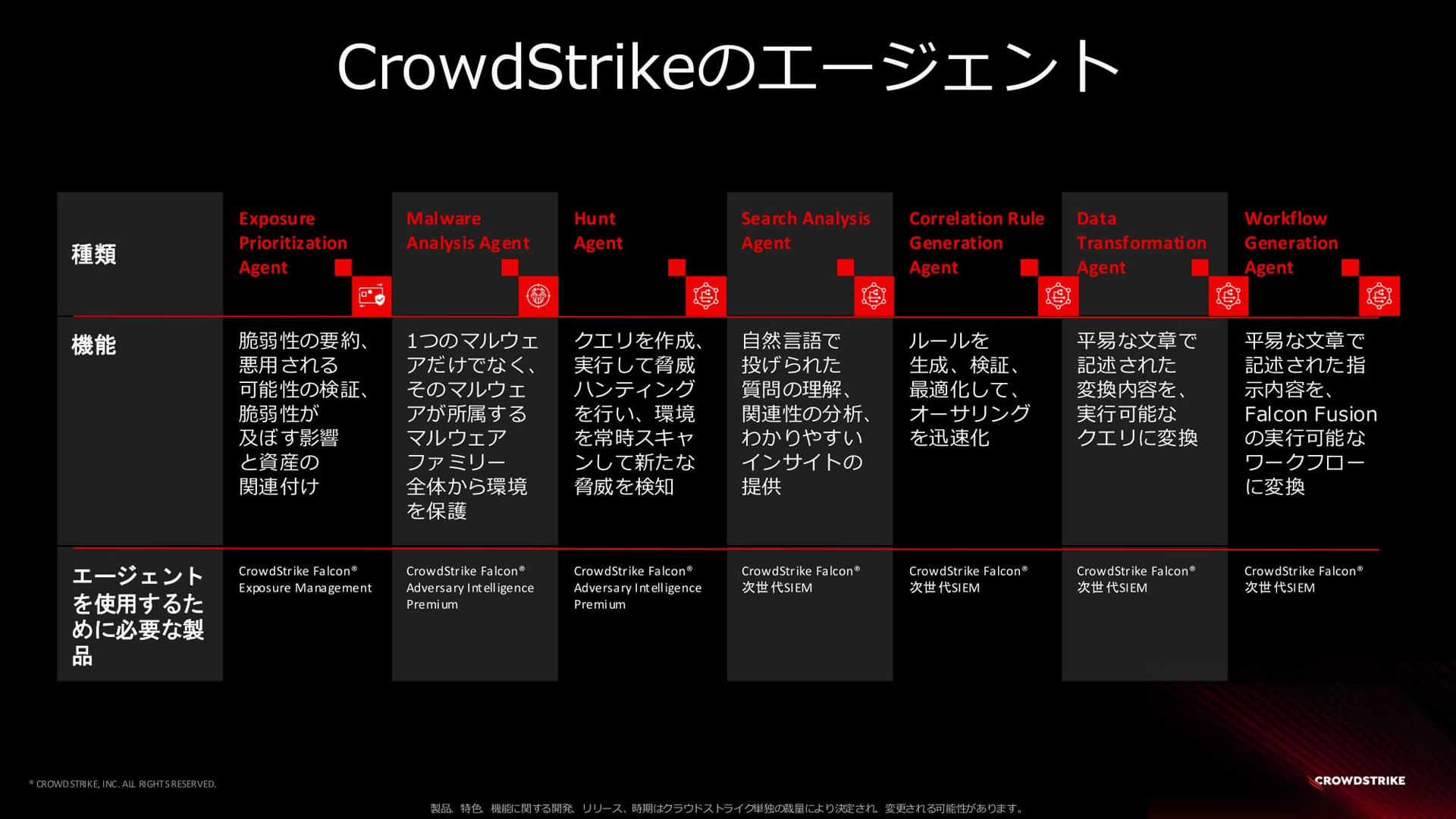 クラウドストライクは2025年10月29日、説明会を開き、セキュリティソフトウェア製品群「CrowdStrike Falcon」に追加するAI機能群について発表した。収集したデータをAIで参照・分析しやすくするグラフデータベースや、AIエージェントのノーコード開発ツール、セキュリティ管理を省力化するAIエージェントなどを提供する。いずれも、同年9月に米国本社が開催したプライベートイベント「Fal.Con 2025」で発表したものである。