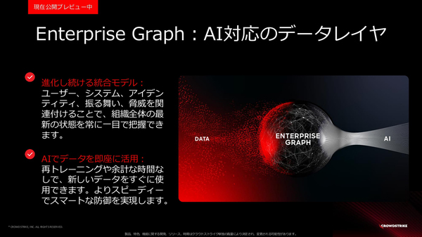 図1:グラフデータベース「Enterprise Graph」の概要。各種のセキュリティ関連情報をAIから参照しやすくする(出典:クラウドストライク)拡大画像表示