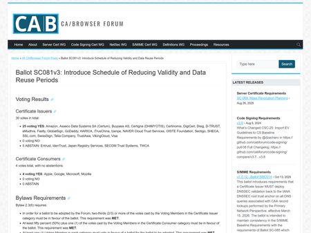 そんな中で、SSL/TLS証明書の認証局(CA)とWebブラウザベンダーによる業界団体CA/Browser Forumは2025年4月に、公開SSL/TLS証明書の最大有効期間を段階的に短縮することを全会一致で可決した(発表文、画面1)。