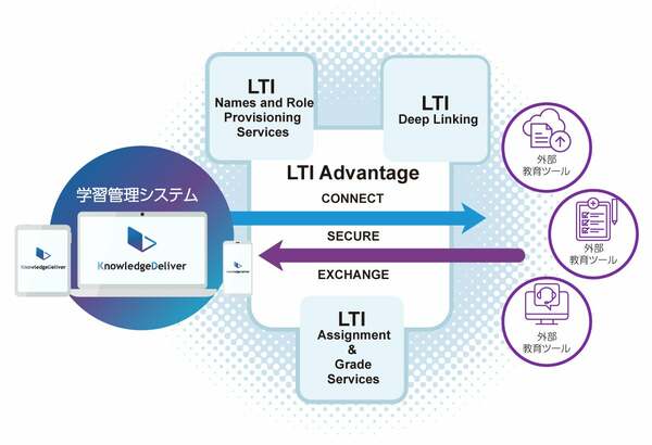 図1:eラーニングシステム「KnowledgeDeliver」と外部システムを標準プロトコル「LTI」で連携できるようにした(出典:デジタル・ナレッジ)拡大画像表示