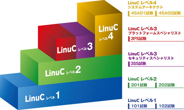 図1:Linux技術者認定資格試験「LinuC」の新レベル体系(出典:エルピーアイジャパン)拡大画像表示