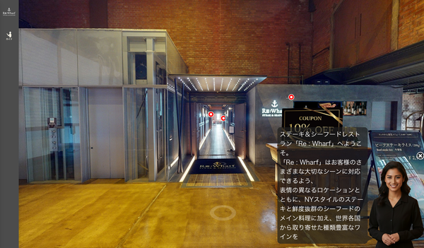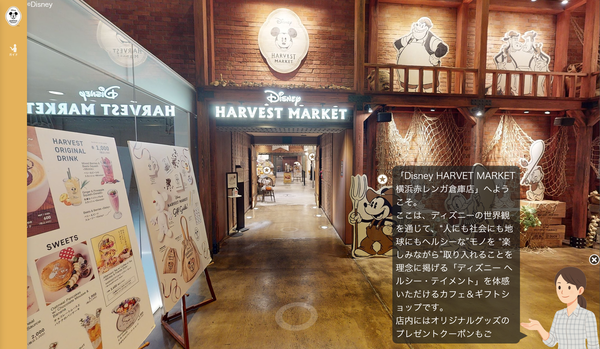 横浜赤レンガ倉庫で人気の高い2店舗を再現した3Dバーチャル店舗を構築している。シーフード/ステーキレストラン「Re:Wharf(リワーフ)」と、カフェ/ギフトショップ「Disney HARVEST MARKET By CAFE COMPANY」である(画面1)。利用者は、実店舗のデジタルツイン、鏡像であるバーチャル店舗にアクセスすることで、実際に来店したような体験(空間、食事、景観など)が得られる。