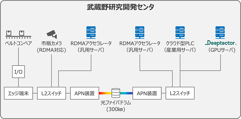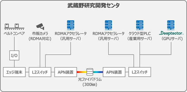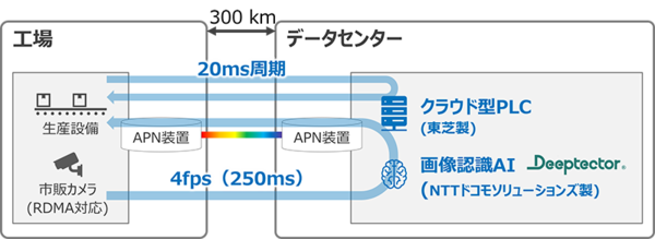 検証環境を、東芝のクラウド型PLC「Meister Controller Cloud PLCパッケージ typeN1」とNTTのAPN(All-Photonics Network:全光ネットワーク)で構成。NTTの武蔵野開発研究センタ(東京都武蔵野市)内に、300km離れた工場とクラウドを光ファイバで接続した状態をシミュレートしている(図1)。