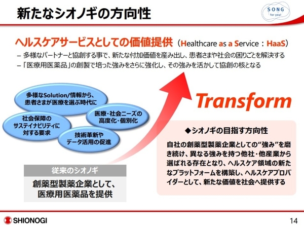 2020年6月に策定された中期経営計画において、シオノギは医薬品のみを提供する製薬企業から、幅広いサービスで患者や社会の課題を解決する「ヘルスケアプロバイダー」への変革を掲げた。創薬で培ってきた強みを生かし、「ヘルスケア・アズ・ア・サービス(HaaS)」をキーワードに、異なる産業を含むパートナーとの共創に取り組んでいる(図1)。