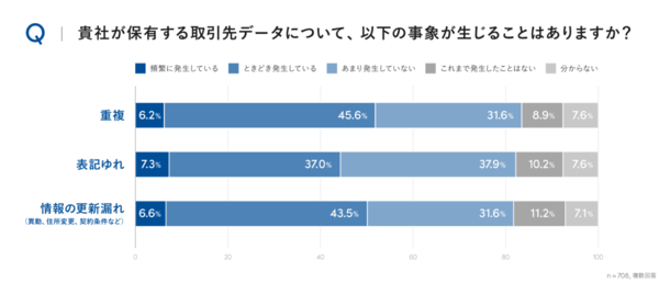 図3は取引先データの品質について聞いた結果だ。83.5%が「重複」、82.2%が「表記ゆれ」、81.8%が「更新漏れ(異動・住所変更・契約条件など)」の経験があると答えている。