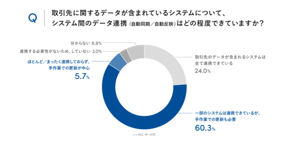 取引先データを扱うシステム間でデータの連携ができているかを尋ねた設問では、「一部のシステムは連携できているが、手作業での更新も必要」(60.3%)が最多だった。「ほとんど/まったく連携しておらず、手作業での更新が中心」(5.7%)を合わせた、手作業中心の企業が66%に上る(図1)。