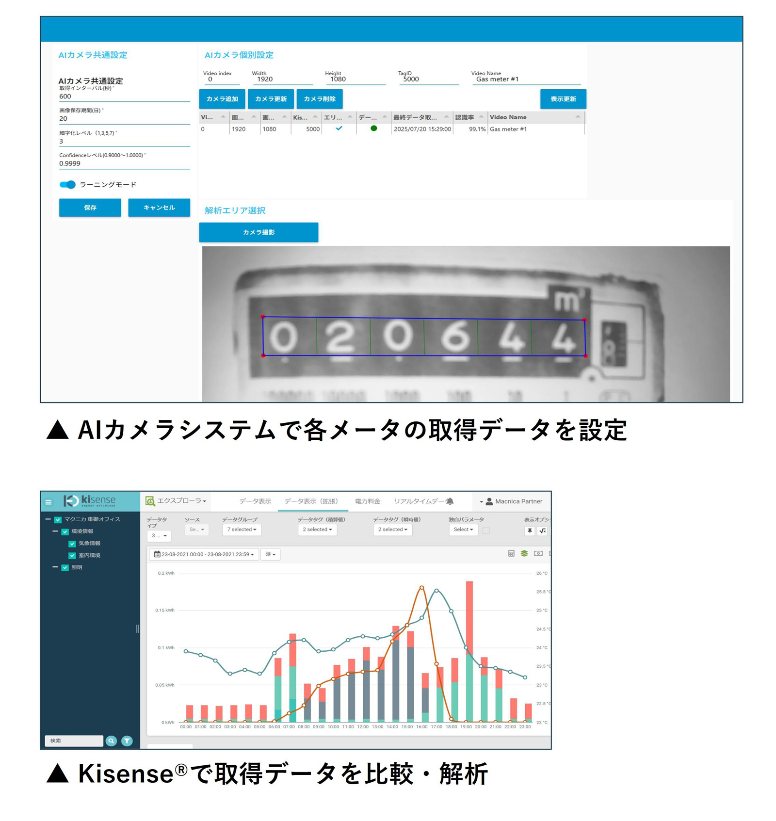 画面1:「AIカメラシステム」のメーター読み取り設定画面(上)とエネルギーデータ管理クラウドサービス「Kisense」のデータ解析画面(出典:マクニカ)拡大画像表示
