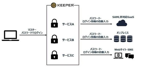 マクニカが販売する「Keeper」は、米Keeper SecurityのID/パスワード管理クラウドサービスである。ログイン先のID/パスワードをデータベース化して、企業・組織内で一元管理するほか、Webブラウザ拡張機能がログインフォームに自動入力する仕組みが備わっている。組織において、SSO(シングルサインオン)非対応のシステム/サイトへのログイン操作を容易にする(図1)。