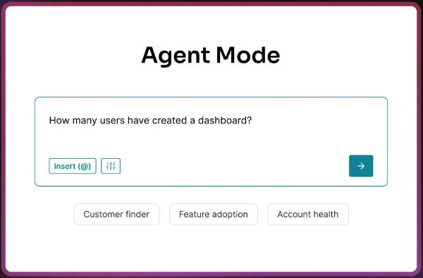 新機能として、Pendoに蓄積されたエンドユーザーのアプリケーション操作データやフィードバックなどを対話型の生成AIで分析する「Agent Mode」(画面1)を追加する。管理者は、フィードバック分析、利用状況レポート作成、ヒアリング調査対象ユーザーの抽出といった種々の作業を自然言語でAIに依頼することができる。