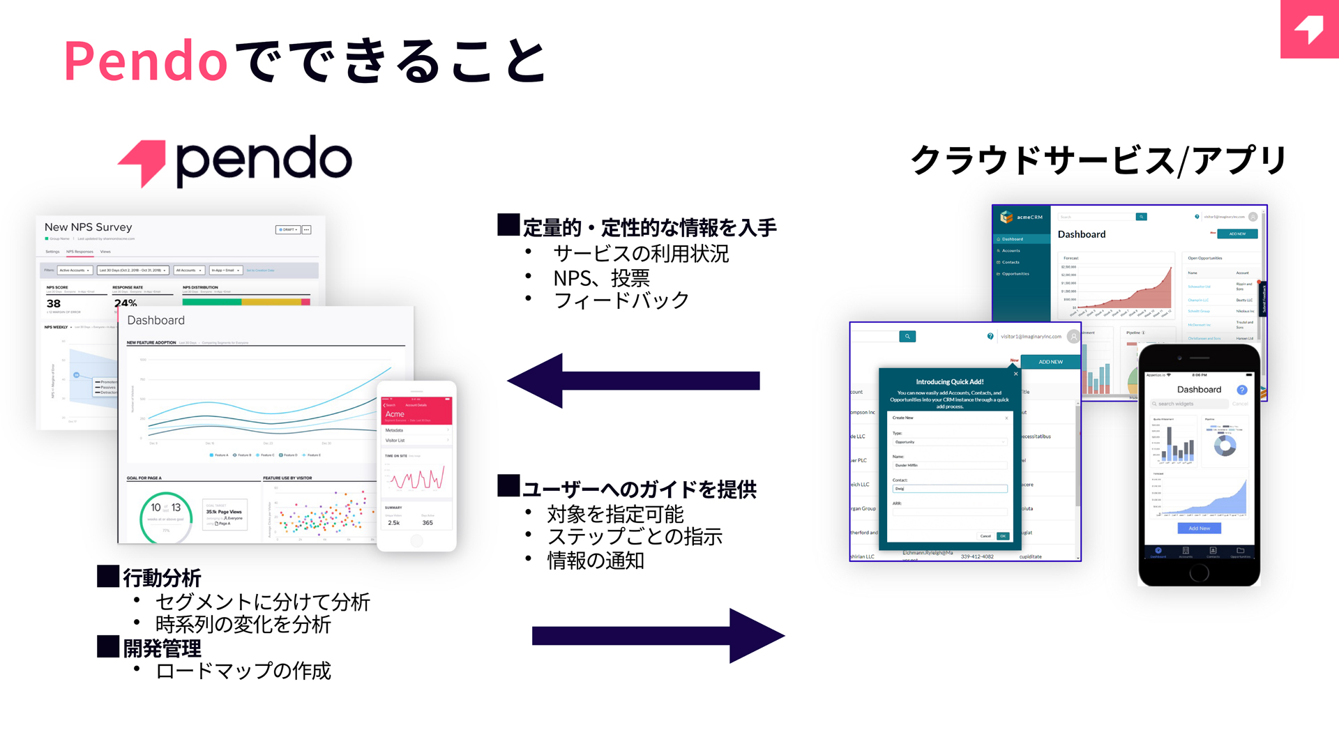 図1:「Pendo」の概要。エンドユーザーの画面に操作ガイドを表示してアプリケーション操作を支援する機能と、アプリケーション利用状況を把握・分析する機能を提供する(出典:Pendo.io Japan)拡大画像表示