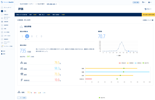NRIセキュアテクノロジーズの「Secure SketCH」は、セキュリティ評価クラウドサービスである。自社のセキュリティ対策状況に関する75個の設問に回答することで、対策状況への客観評価が得られる(画面1、関連記事:セキュリティ評価サービス「Secure SketCH」にグループ企業/委託先の統制を容易にする「組織管理オプション」)。