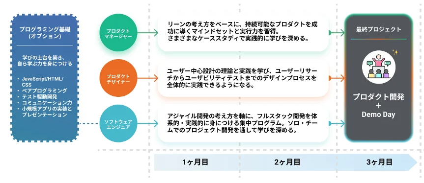 役割別のトレーニング:プロダクト開発に必要なプロダクトマネジャー、プロダクトデザイナー、ソフトウェアエンジニアに対し、それぞれに適したスキルを教育する。これら3役で構成される「プロダクトチーム」として機能することを目指す。