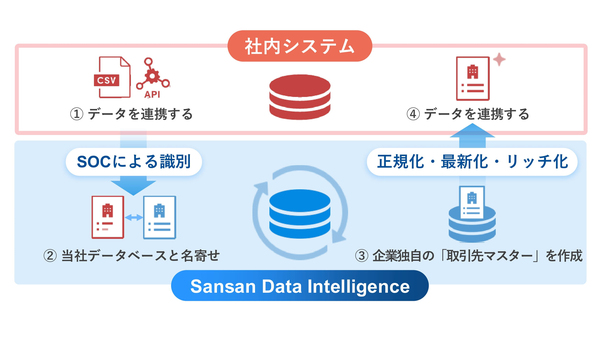 Sansanは2025年11月21日、取引先データ正規化サービス「Sansan Data Intelligence」を同年12月下旬から提供すると発表した。企業が保有している取引先企業のデータを、Sansanが管理する800万件超の企業データベースを用いて名寄せ・正規化・最新化する。加えて、管理外の項目を追加して取引先企業データに情報を付加できる。