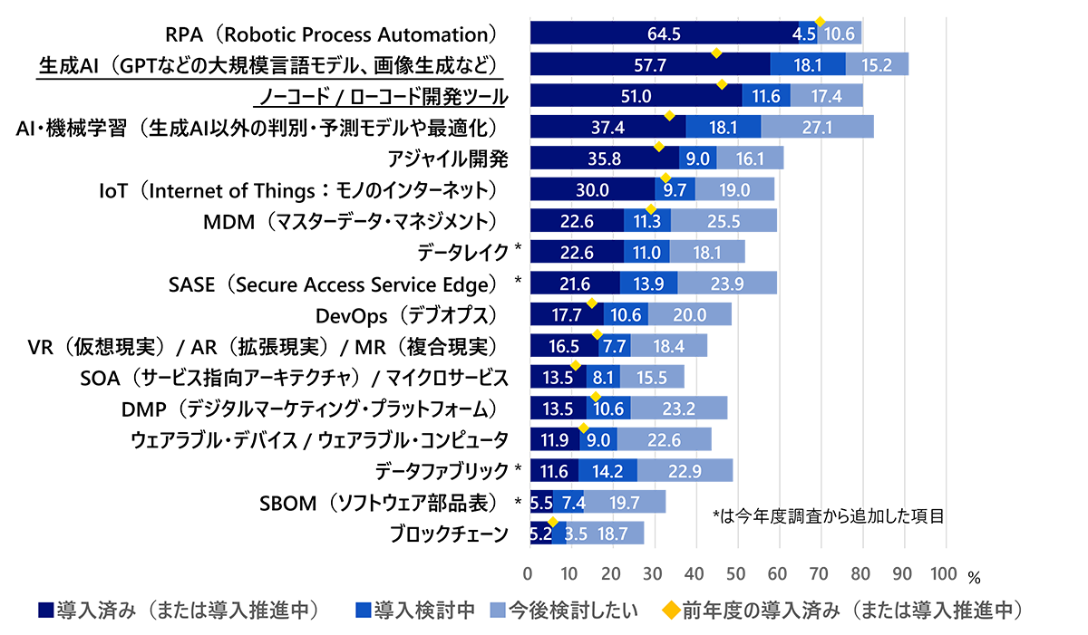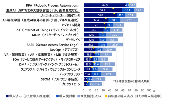 ソースコードを記述しない、ないしは最小限の記述でプログラム開発を行う「ノーコード/ローコード開発」の導入率は、2024年度から4.9ポイント伸びて51%になった。「システム開発の効率化や専門知識がないユーザーが自ら開発を行う市民開発における利用が拡大している」(NRI)。