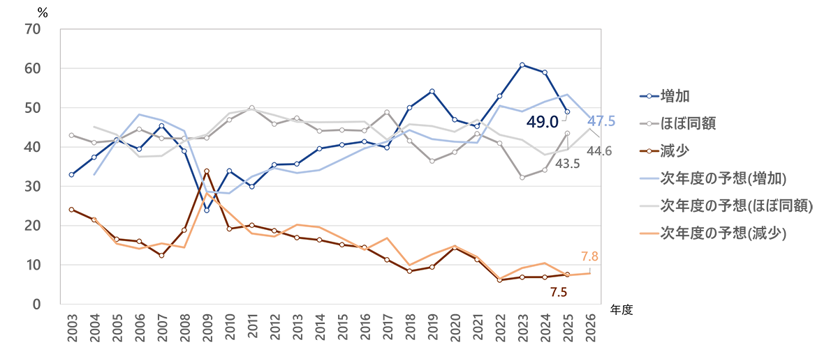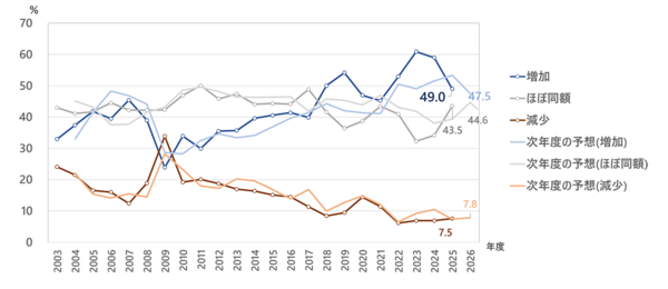 図1:IT予算額の2024年度対比(増減)および2026年度の予想(時系列調査結果)(出典:野村総合研究所)拡大画像表示