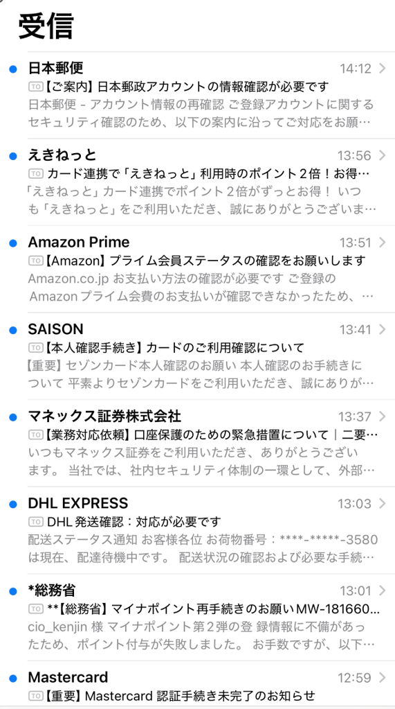 画面1:筆者のメールアカウントに届く大量の詐欺メール拡大画像表示