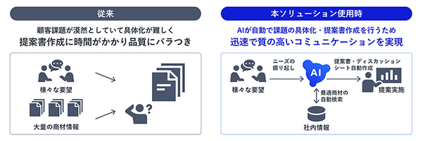 同ソフトを活用することで、個々の顧客に向けた提案書の作成や準備にかかる時間を短縮する。提案書と同時に作成するディスカッションシートは、顧客側の懸念や今後の商談・会議などで顧客に確認すべき項目を整理した資料で、商談初期のアプローチを支援するとしている。