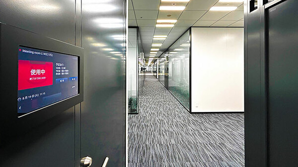 約600ある会議室・ミーティングエリアのうち約420室には、会議室の運用管理システム「SmartRooms」(写真1)を導入。予約・入退室管理システムやサイネージと連携して空室情報を可視化する。残る約180の会議室は、SmartOfficeNavigatorとの連携で、フロアマップ上で検索・予約や状況確認が行える。