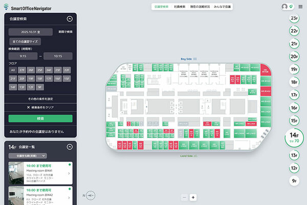 新しい取り組みを支える仕組みとして、内田洋行が開発・提供する、オフィス内各室の利用状況可視化/案内システム「SmartOfficeNavigator」(画面1)を導入した。社員の在席/位置情報(会いたい人がどこにいるか)に加えて、会議室・ミーティングエリアの空き/予約状況を、フロアマップ上で直感的に確認することができる。会議室予約システムや無線アクセス機器(Cisco Spaces)と連携し、利用状況や混雑度などの利用実態も把握できる。