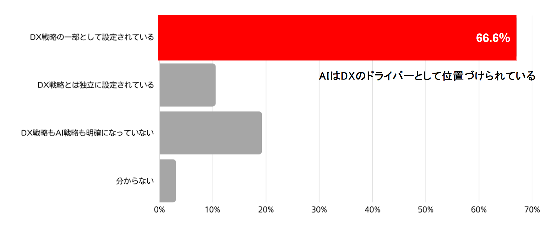 図2は、企業がAIをどのように位置づけているかを聞いた結果で、66.6%が「DX戦略の一部としてAIを扱う」と回答。「AIが実質的にCDOの “変革の中核のドライバー”とされている状況を示している。責任体制・統制・投資判断がDXの推進体制に委ねられている現状が明らかになった」(同組織)。