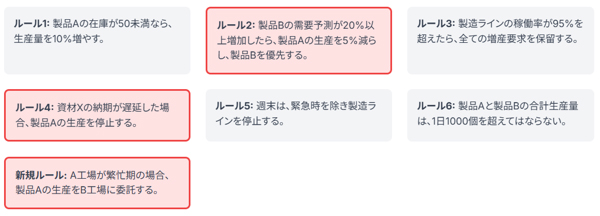 図2は、生産量の調整において、新規ルールの追加によってルール間の矛盾が発生する例である。同社はこれについて、「一見シンプルに見えるが、多くの要素が絡み合っており、事前にすべてのパターンをルール化することは困難である」と指摘。ルール化が難しい要因として、リソースの制約(ある製品の増産には他の製品の減産が必要)や工場間の連携(自工場だけで対応できない場合は他工場への生産依頼や製品輸送の手配が発生)などを挙げている。