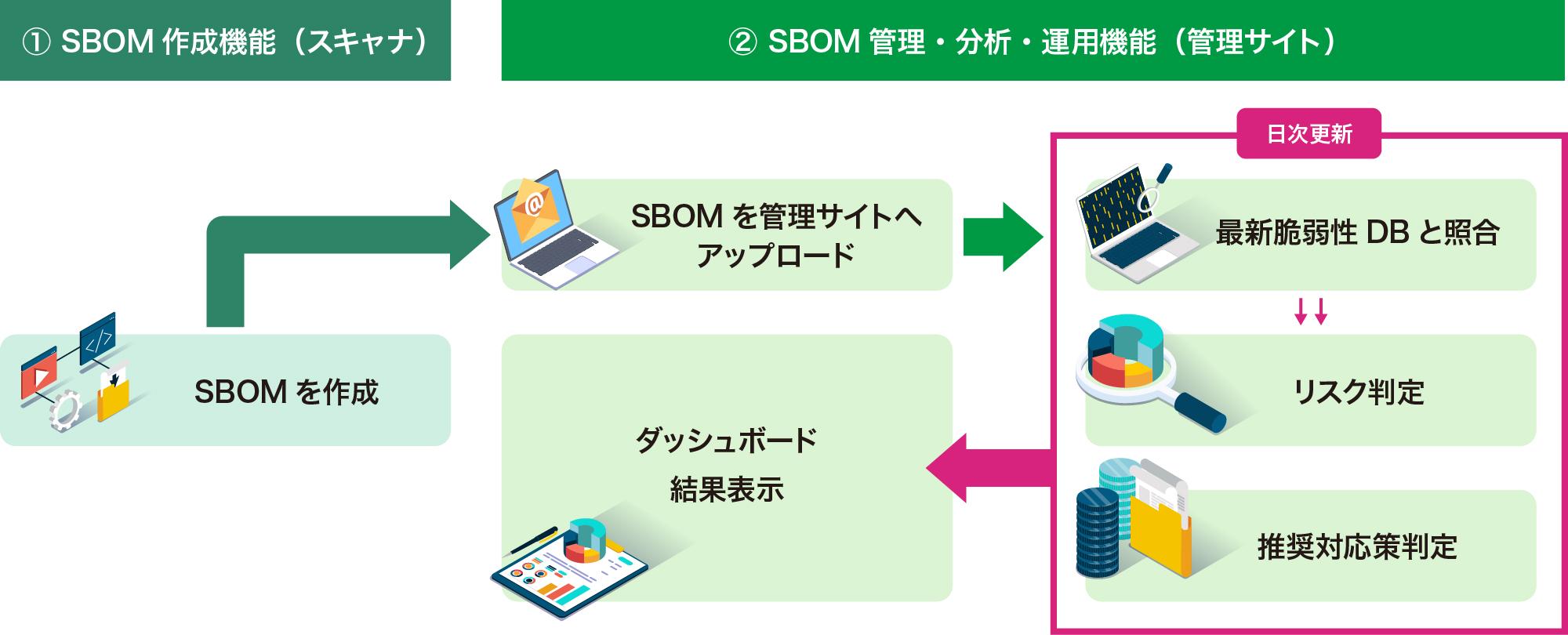 AGEST(アジェスト)の「SBOM管理ツール」は、SBOM(ソフトウェア部品表)を管理するソフトウェアである。管理対象サーバーをスキャンしてSBOMを作成する機能と、作成したSBOMを基に、最新の脆弱性データベースと照合してリスクを判定し、推奨する対応策を提示する機能を備える(図1)。