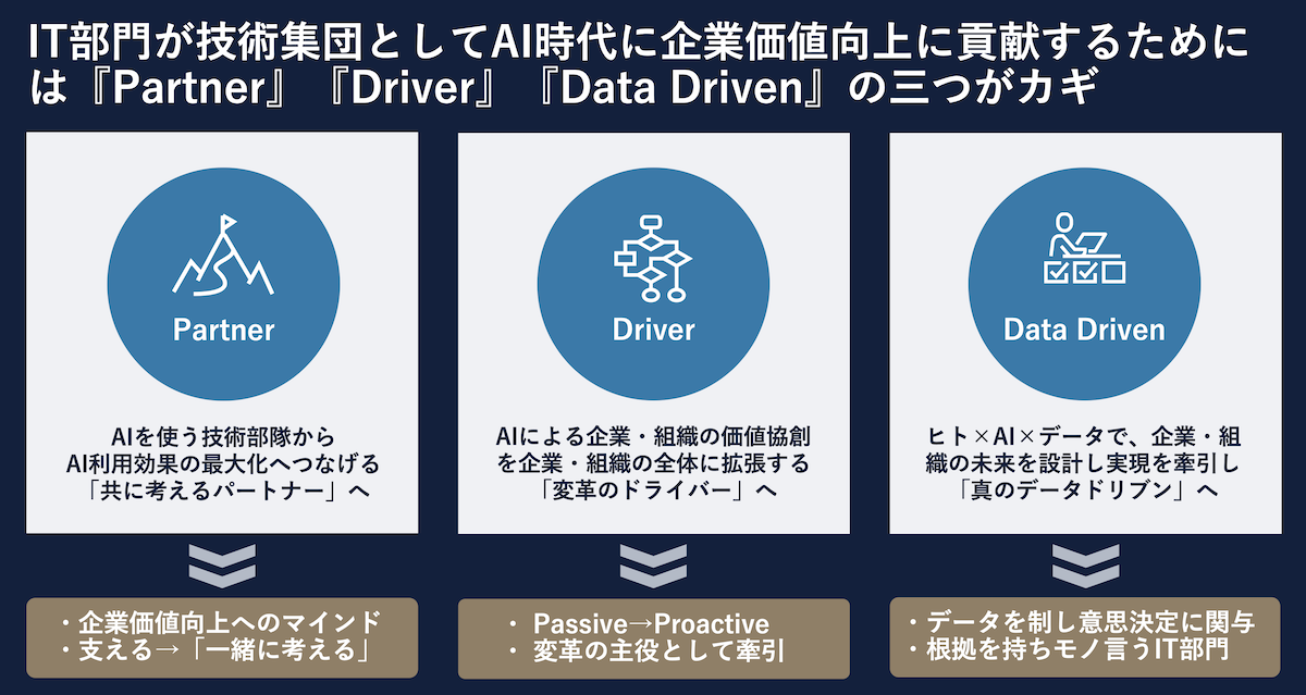 これからの時代においてIT部門が企業価値向上にどれだけ貢献できるかは、AIの利用効果の最大化に向け現場とともに考える「パートナー」、さらに、AIによる価値創出を企業全体に拡張する変革の「ドライバー」としての活動を通じ、“人×AI×データ”で「データドリブン」により企業・組織の未来を設計し、実現に向け牽引できるかが鍵を握るという(図5)。