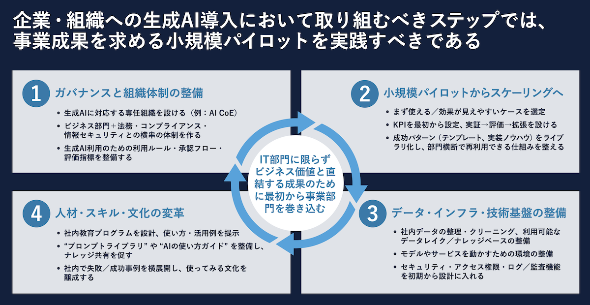 - 小規模パイロットからのスケーリング:効果が見込めるユースケースの見極めと、成功パターンの横展開