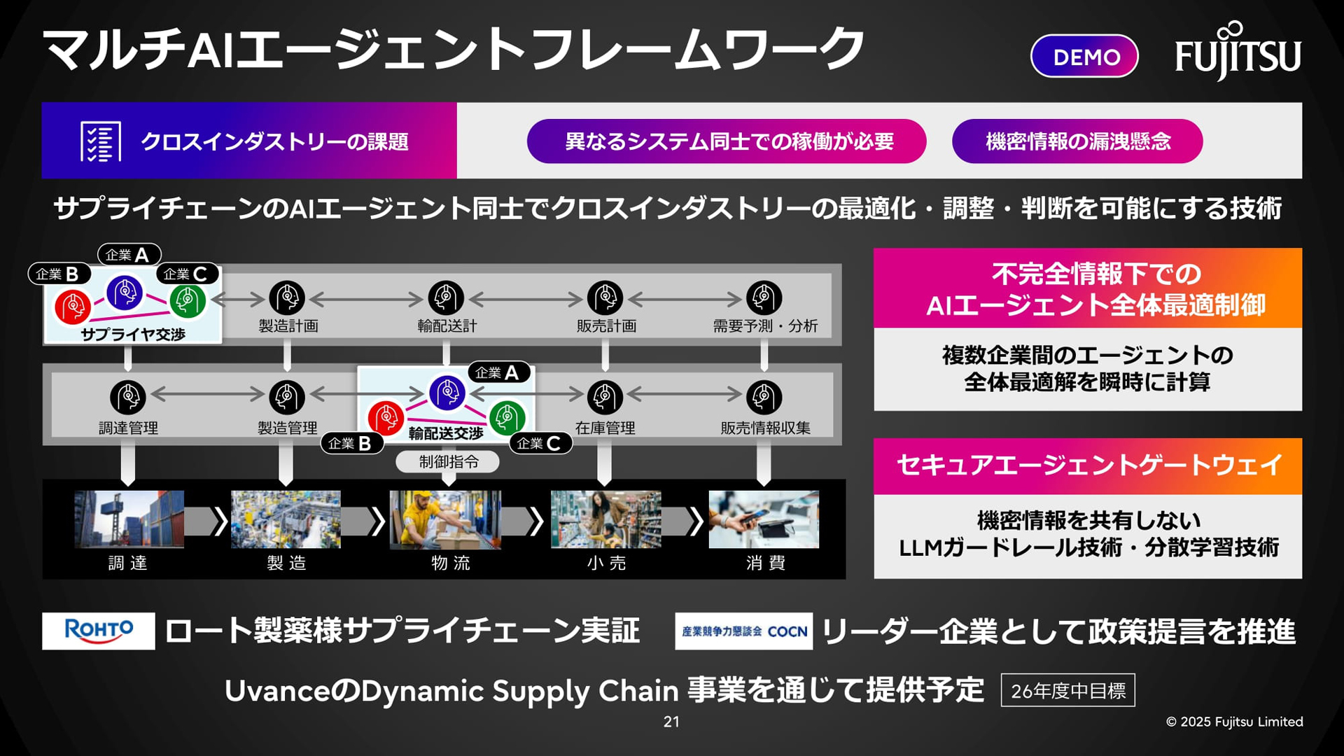 AIエージェントの高度活用の試みとしては、マルチAIエージェント連携技術を開発している。サプライチェーン構成企業のそれぞれで動作するAIエージェント同士が、自律的に判断・交渉しながら全体最適を図る仕組み。情報が不完全な状況下でも全体最適制御が可能になる(図3、関連記事:ロート製薬、企業間AIエージェント連携でサプライチェーンを最適化、検証では運搬コストを3割減)。