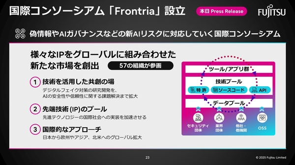 図4:富士通が設立した、AIリスク対策に取り組む国際コンソーシアム「Frontria」の概要(出典:富士通)拡大画像表示