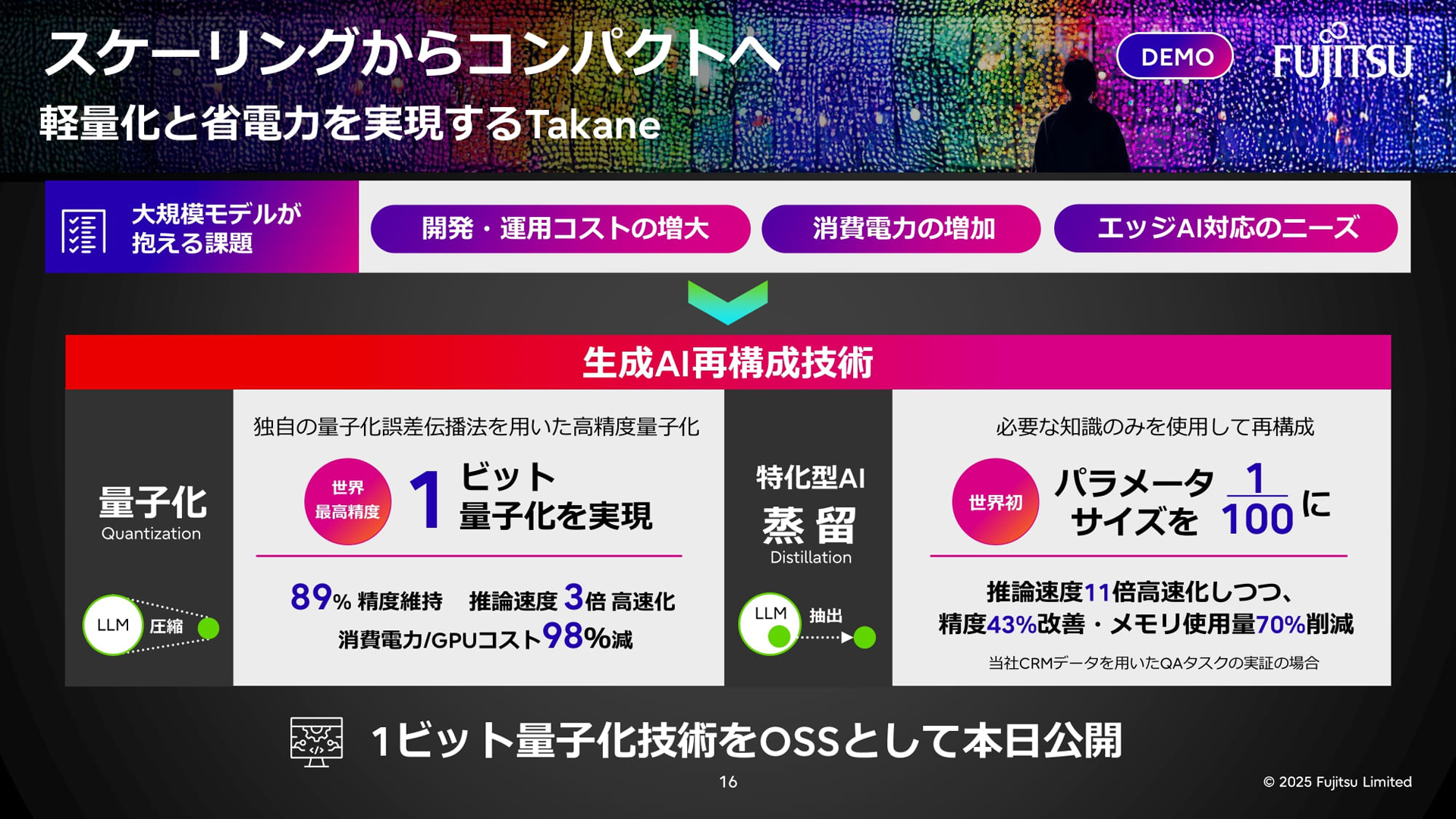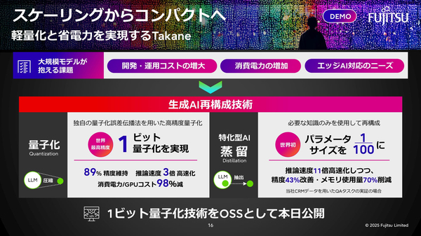富士通は2025年12月2日、技術開発の説明会を開き、AI、CPU、量子コンピュータなどの直近の取り組みを説明した。AI領域では、AIモデルを軽量化する1ビット量子化ソフトウェアを同日付でGitHubで公開。合わせて、生成AIの偽・誤情報対策に取り組む国際コンソーシアム「Frontria」の設立している。CPUについては、富岳NEXTに搭載予定の「MONAKA-X」などのロードマップを示した。