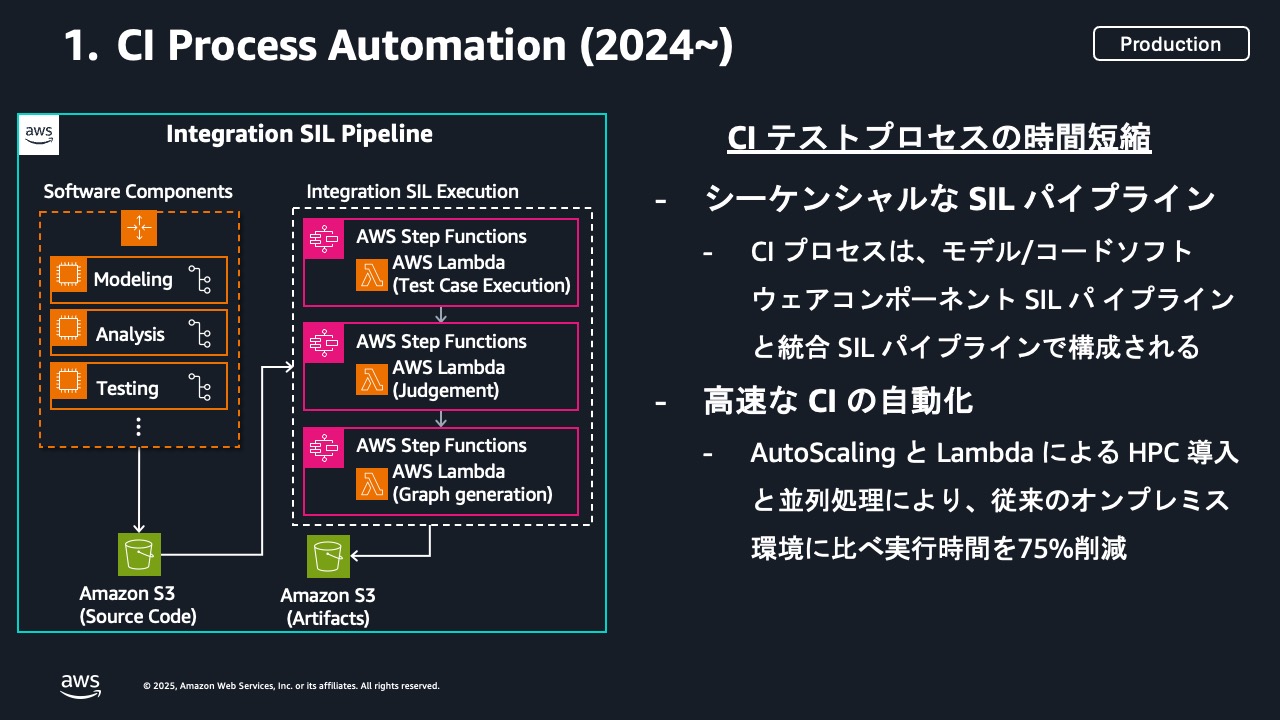 AWS Lambdaを活用した並列処理により、車載ソフトウェアのテスト実行時間を75%削減した。また、テストケースの実行から判定、結果のグラフ生成まで、全工程を自動化することで、開発者の作業効率を改善した。