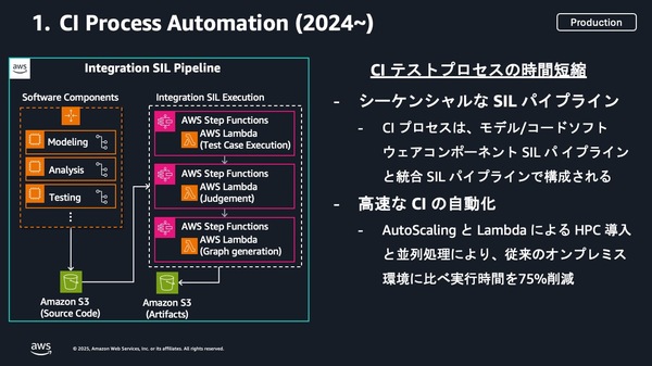 従来、車載ソフトウェア開発のCIパイプラインは、オンプレミスのサーバーで実行しており、テストに多大な時間がかかっていた。今回、「AWS Step Functions」と「AWS Lambda」を用いた新しいパイプラインをクラウド上に開発した(図2)。