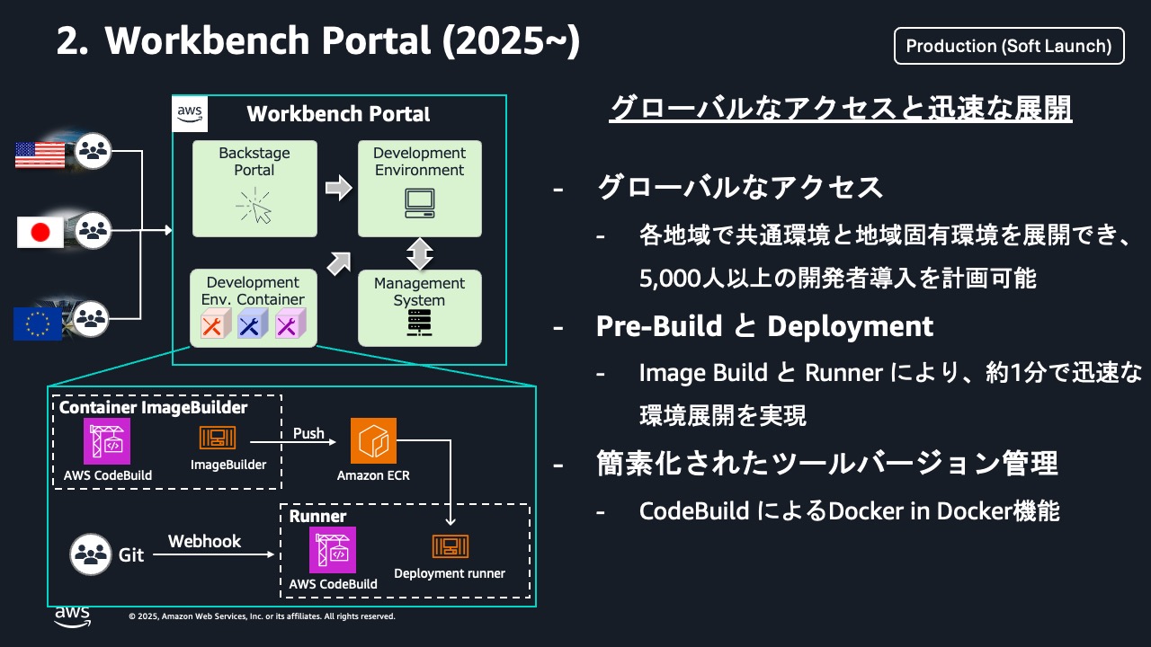 また、世界中に在籍する5000人以上の開発者が利用する共通の開発環境として、AWS上にワークベンチポータルを開発した(図3)。BackstageをベースとしたUIを採用し、世界中のエンジニアが統一された環境で作業できる基盤を提供する。