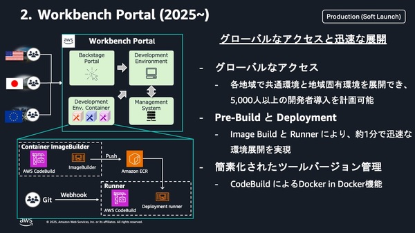 図3:AWS上に構築した、5000人以上の開発者が利用するワークベンチポータルの概要(出典:アマゾン ウェブ サービス ジャパン)拡大画像表示